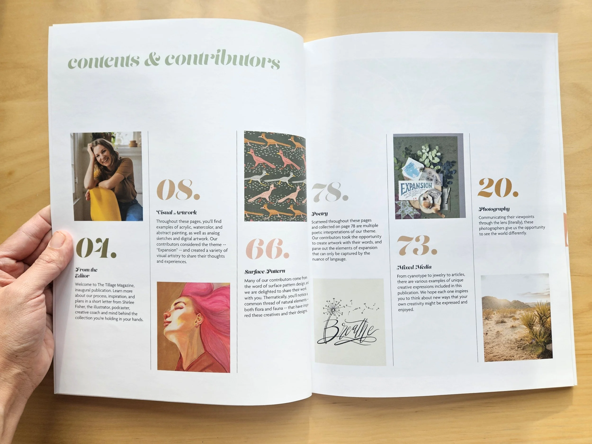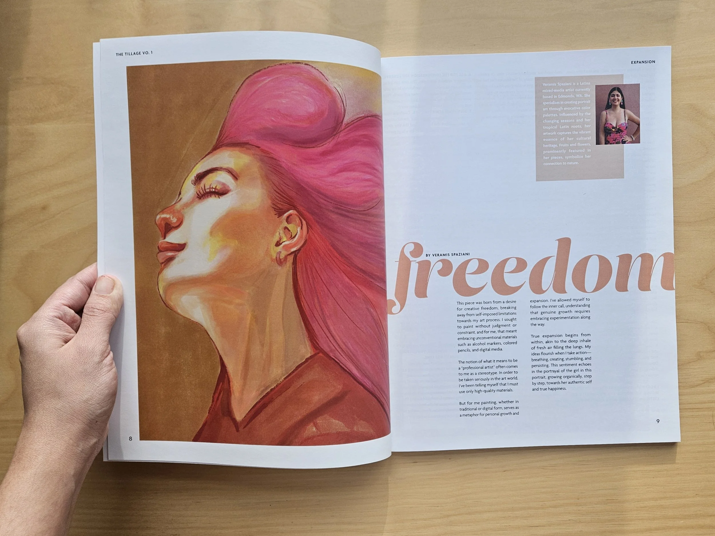 In late 2025, my writing and artwork were published in the "Expansion" Fall Edition of The Tillage Vol.1, alongside the work of other contemporary artists, from art and photography to poetry. The feature includes my written piece exploring themes of art and growth, accompanied by both my traditional and digital paintings. The published work highlights my use of unconventional materials, including alcohol markers and Procreate, as a core part of my illustration practice.