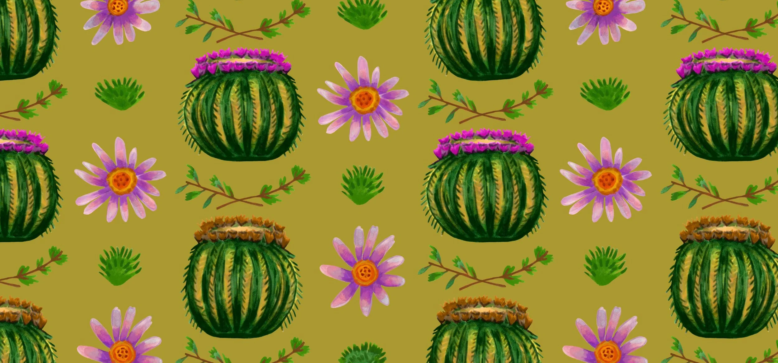 In Sunny with Cactus, I aimed to capture the warmth of the desert while using complementary and analogous colors to let each motif stand out with contrast.
