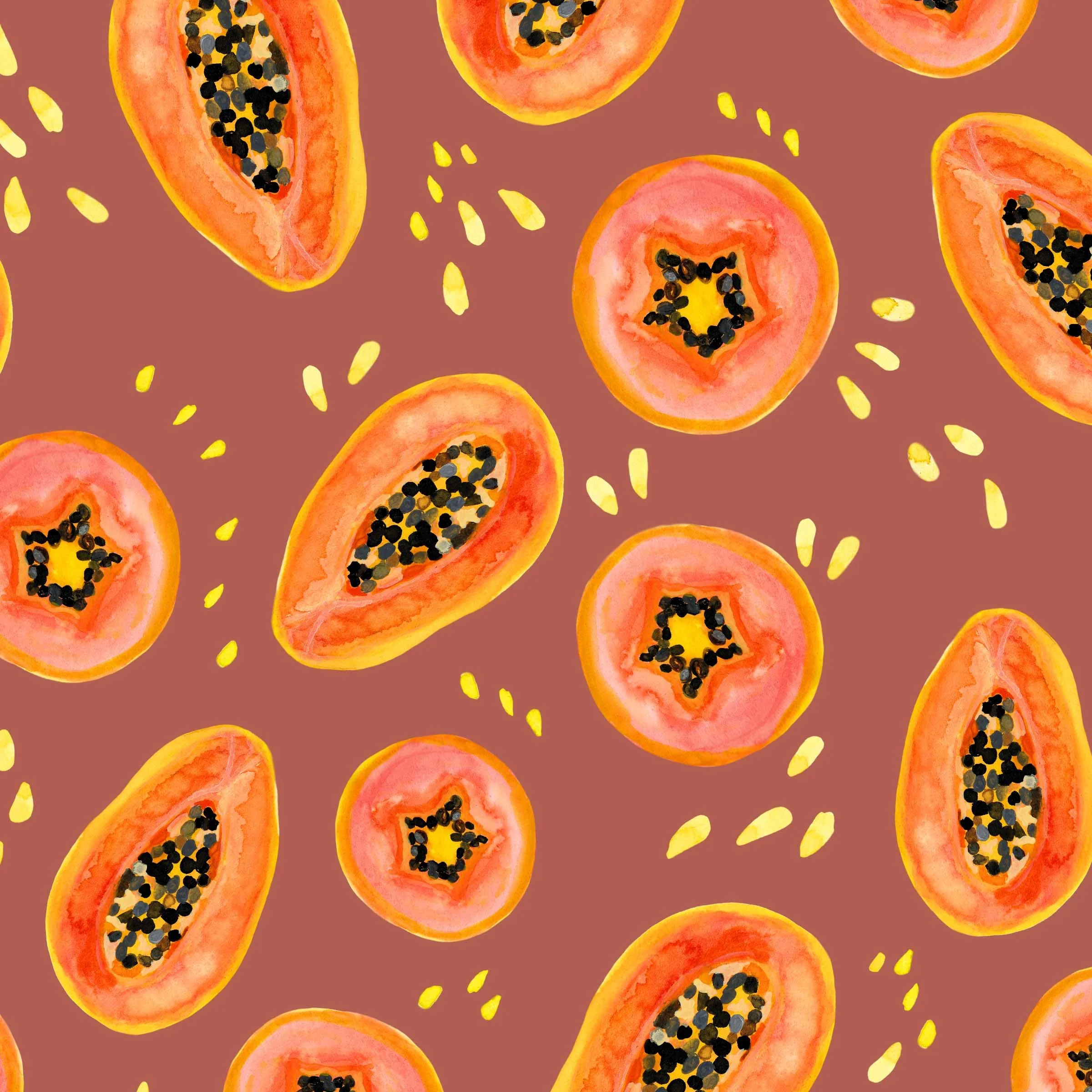 This pattern collection is a celebration of the taste of flavorful juicy fruit. Tropical Harvest is my watercolor celebration of the colors of Summer in Southern Mexico. With ornamental details inspired in Hacienda-style elements and a warmth palette it invites you to feel bold, vibrant, and sun-kissed.