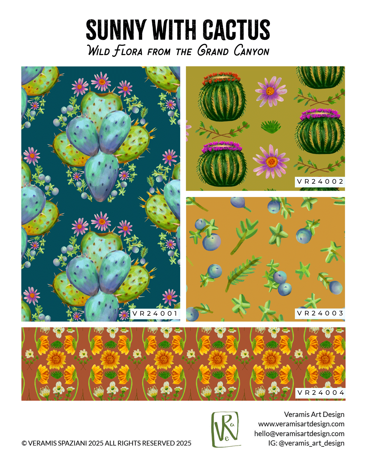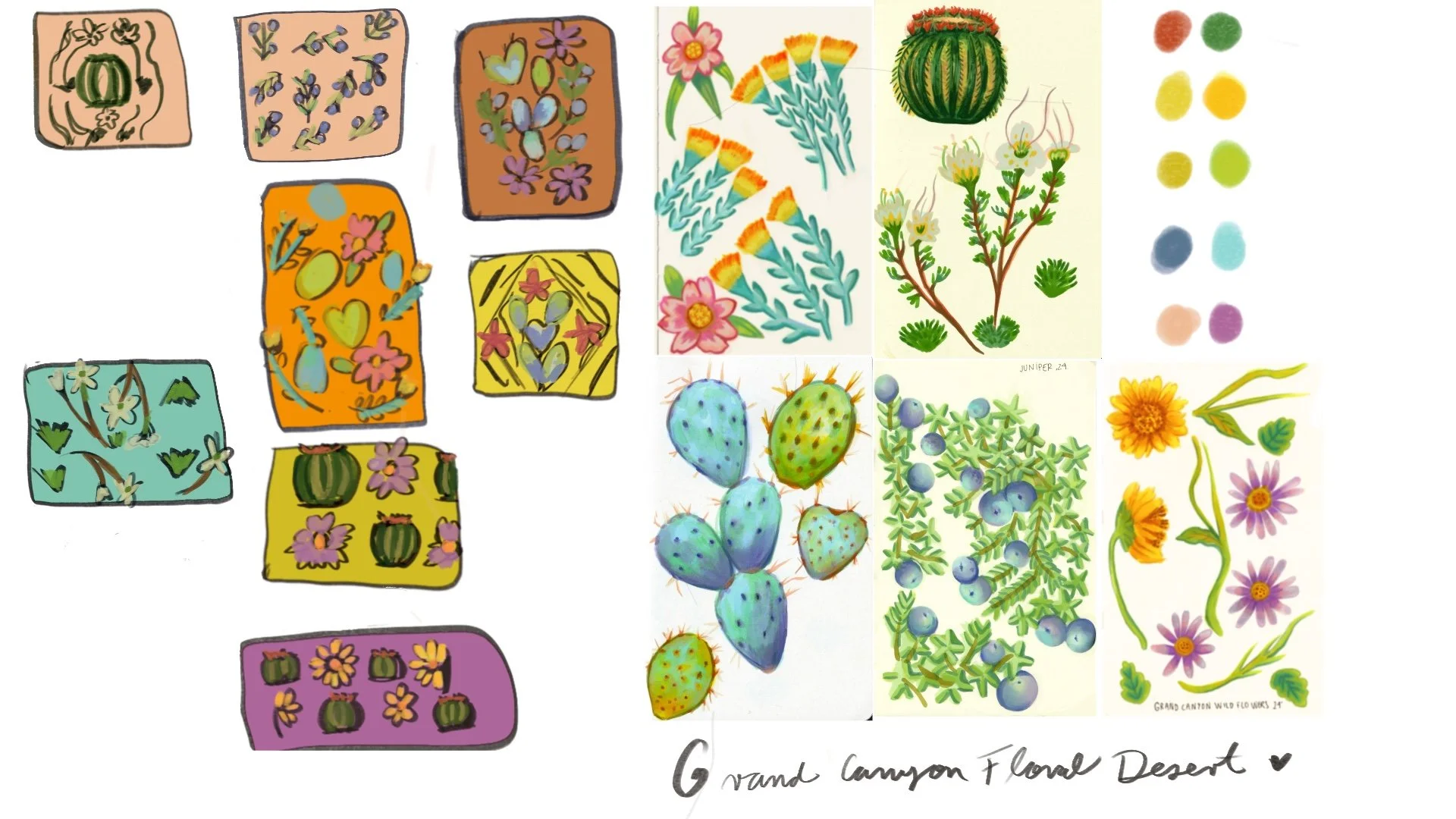 Sunny with Cactus is a collection inspired by my travels to the Grand Canyon and Sedona. Created with alcohol markers, Procreate, and seamless patterns in Photoshop.